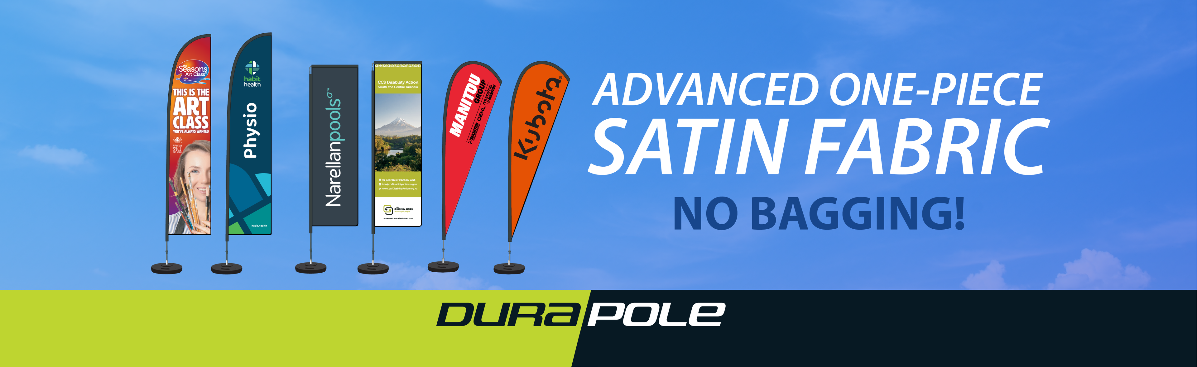 Experience elegance with our Durapole Teardrop Flags, crafted from durable satin fabric that ensures a sleek appearance with no bagginess, exceptional resilience against the elements, and vibrant graphics that captivate with a denser, richer image.