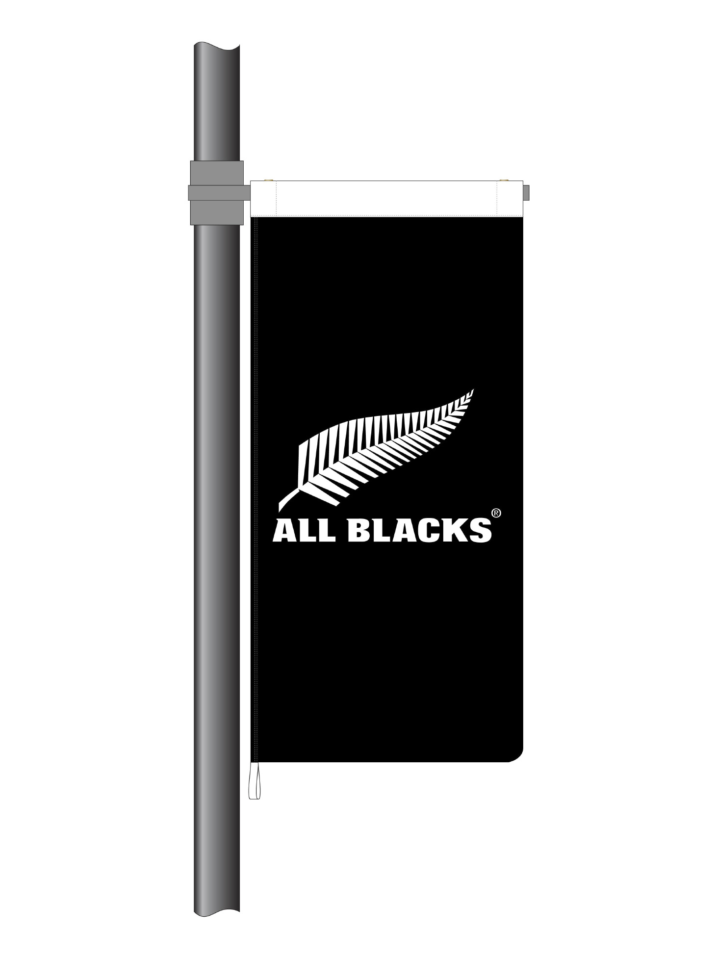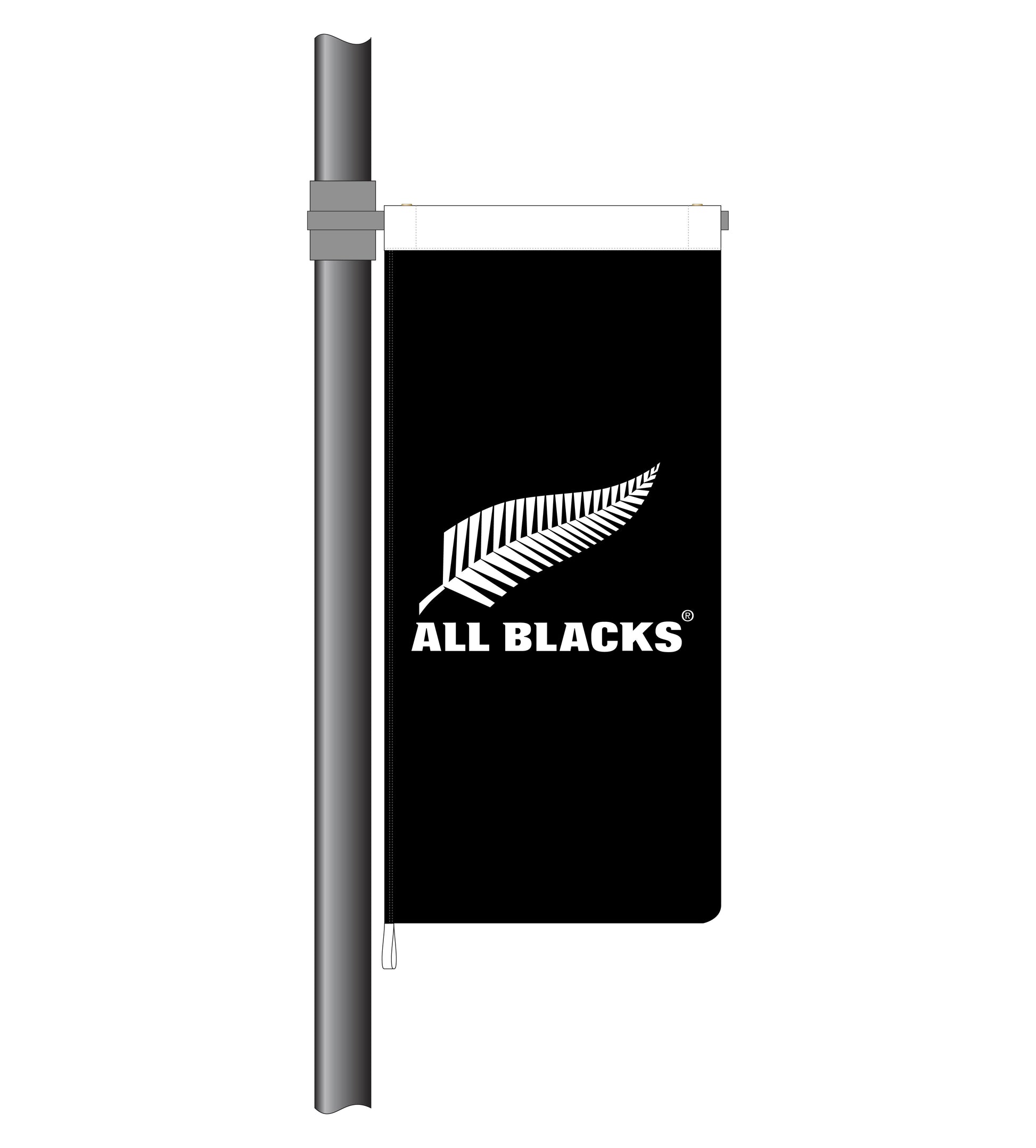 This All Blacks Street flag is dye screen printed on 100% polyester fabric with a heavy-duty nylon header and reinforced polyester webbing. Designed to fit a standard 900mm street flag bracket,